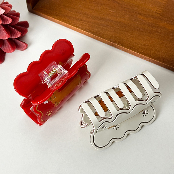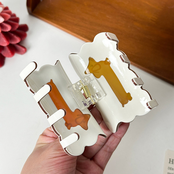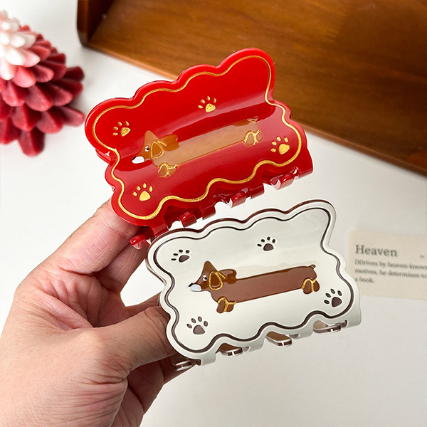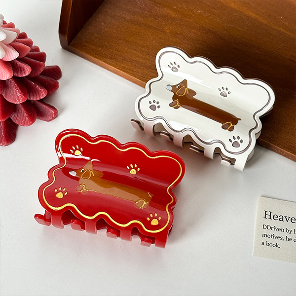 This hair clip features an irregular cloud shape with a cute dachshund at the centre of the design and two simple paw prints. It has a childlike and fun design, with lots of vitality. The clip comes in a medium size, which is perfect for creating a casual half-up hairstyle with a natural touch, or for securing a bun into a neat and adorable hairstyle.